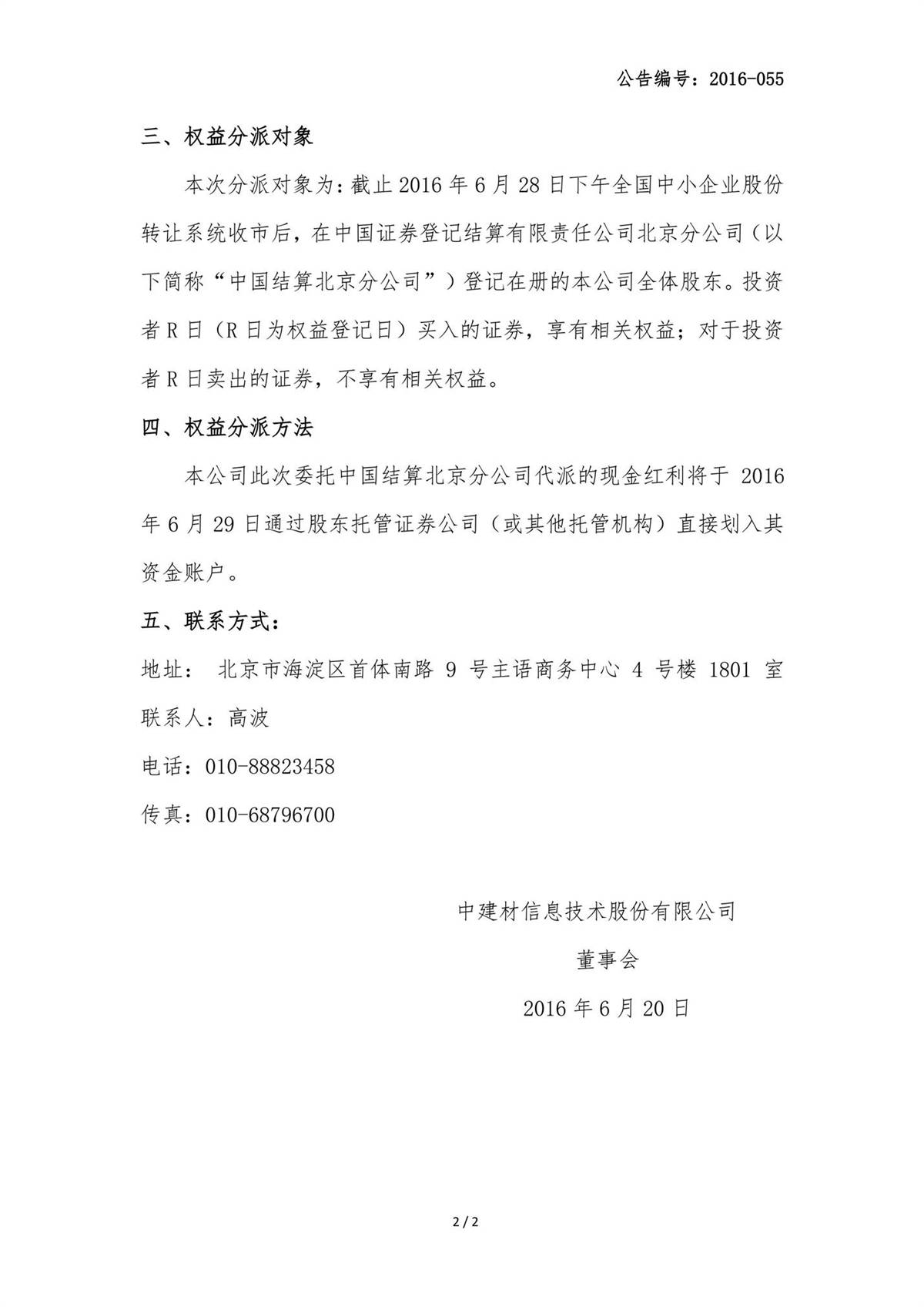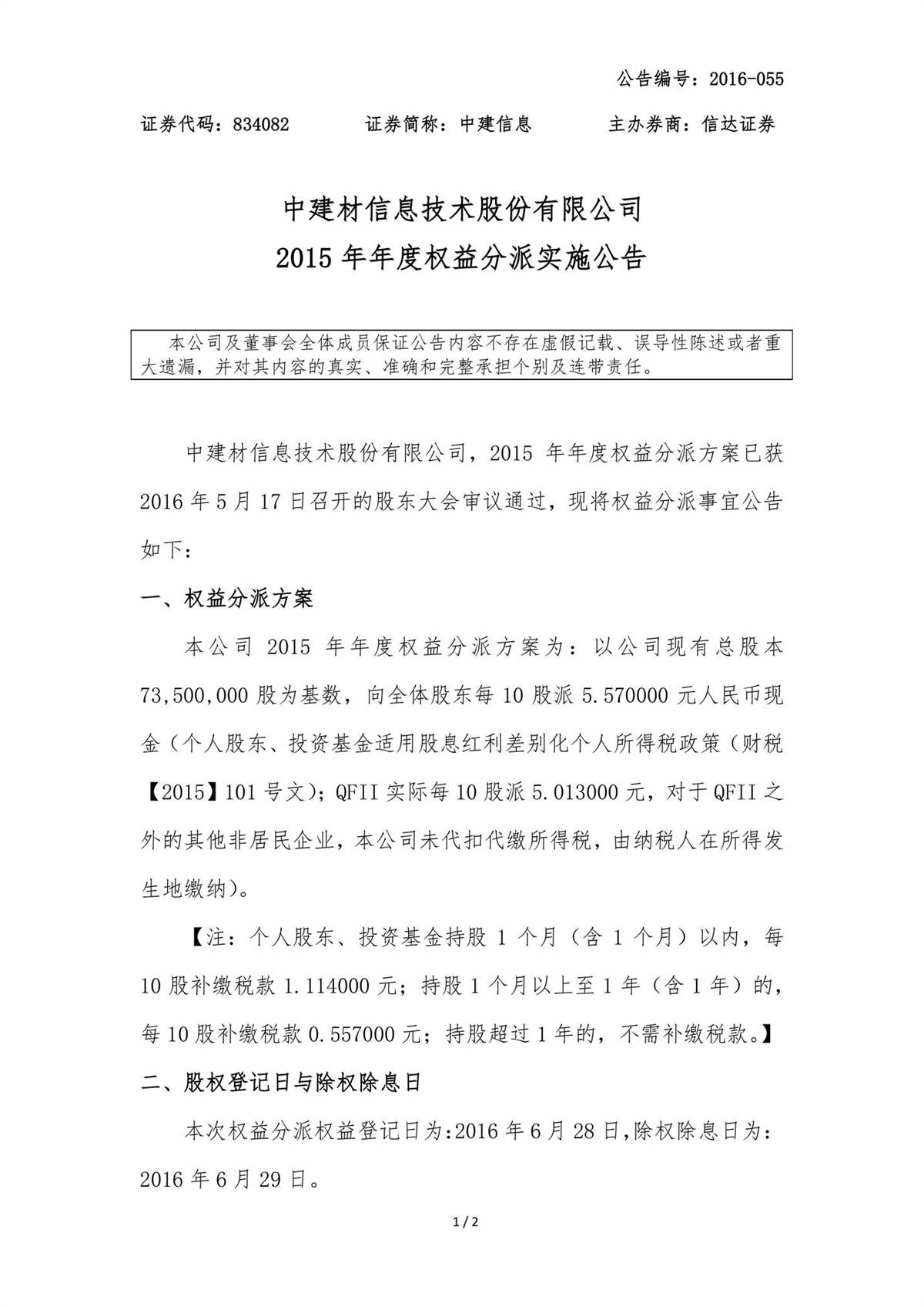 中建信息2015年年度權(quán)益分派實(shí)施公告